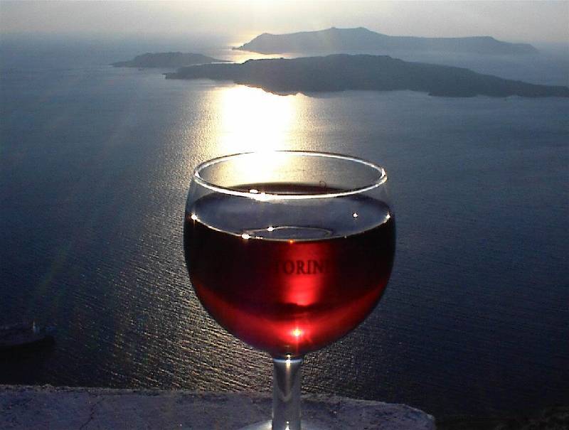 Vinsanto és a vulkán naplementében (Szantorini, sz)
