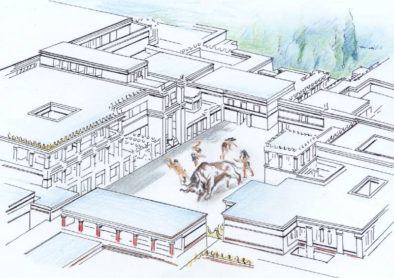 Evans a palota piros oszlopait a feltáráskor előkerült eredeti freskók alapján rekonstruálta (Knósszosz, szerző alapján rajzolta NK)