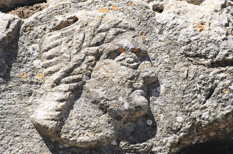 Zeusz arcábrázolás az Artemidorosz-szentélyben. A kisázsiai eredetű ókori faragások mellett archaikus görög írásokkal is találkozhatunk a Mesza Vouno hegyen. (Szantorini, sz)