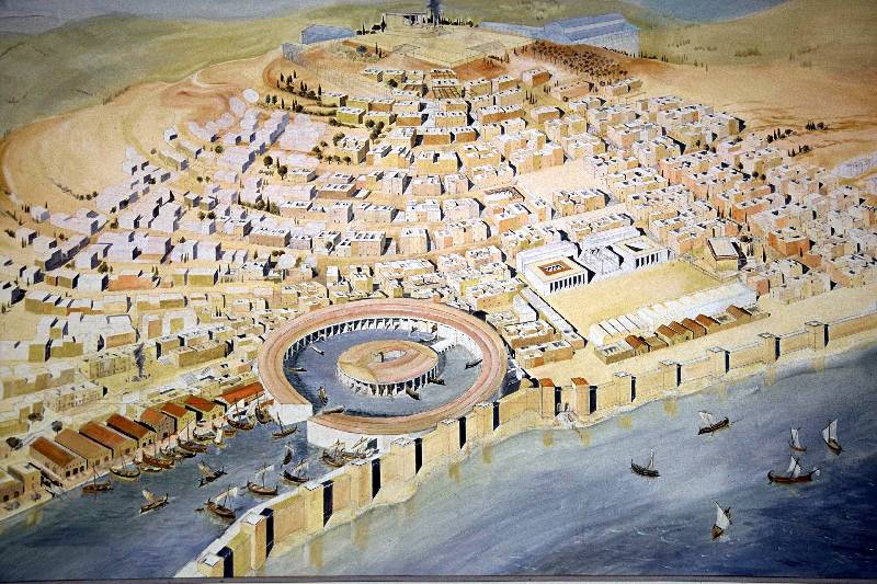 A mesterien kiépített karthágói kikötőt az ókorban sokan megcsodálták. Elől volt a tenger felé nyitott kereskedelmi kikötő, mögötte – vele összeköttetésben – a kör alakú hadikikötő. (Tunisz, MNCT plakátrajz, sz)