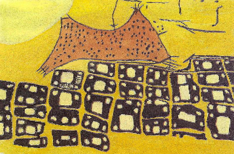 Közel tízezer éves neolitikus rajz Çatal Hüyükből. A Hasan Dag vulkán a város közelében működött. A vulkán mellől kibányászott obszidiánnal kereskedtek a környék lakói. (isz)