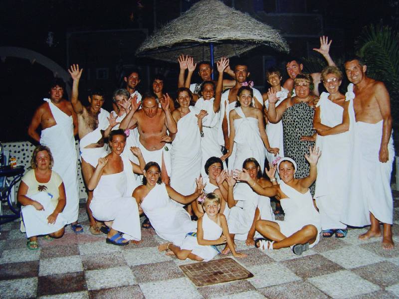 Az általam szervezett maglódi „atlantiszi” csoport Szantorinin. Utolsó este mindenki tógába öltözött, hogy elbúcsúzzon a felejthetetlen napoktól. A szerző jobb oldalon áll a felesége mellett. (Szantorini, Perissza, SE)