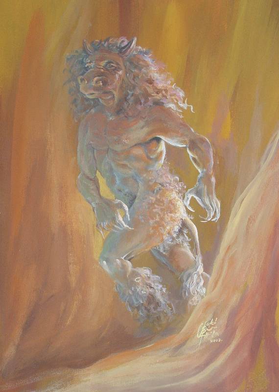 ábrázolja az embertestű, bikafejű szörnyet, amint támadóan lép elő