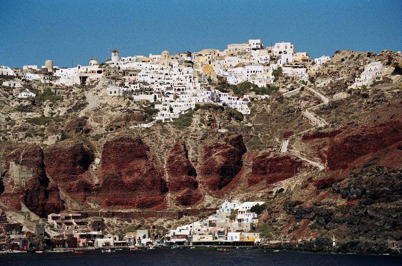 Oia a kaldera északi peremén épült. 1956-ban az épületek jelentős része egy