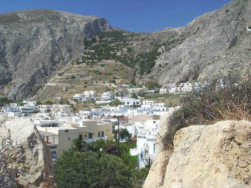 Théra város romjai. J. oldalon a hegygerinc alatt a fehér kis kápolnánál rácsodálkozhatunk