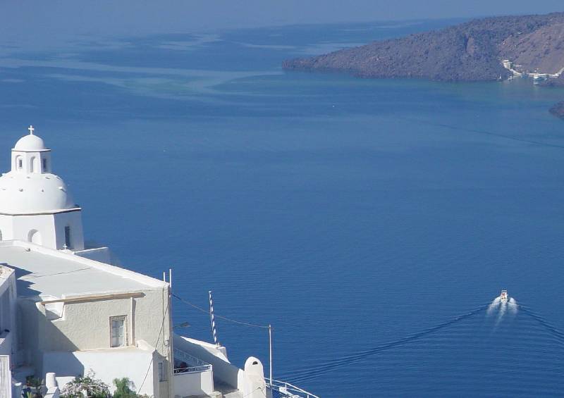 Reggel még nyugalom van, de amint megjelenik az első tengerjáró hajó a kalderában a főváros ritmusa felpörög (Fira, sz)