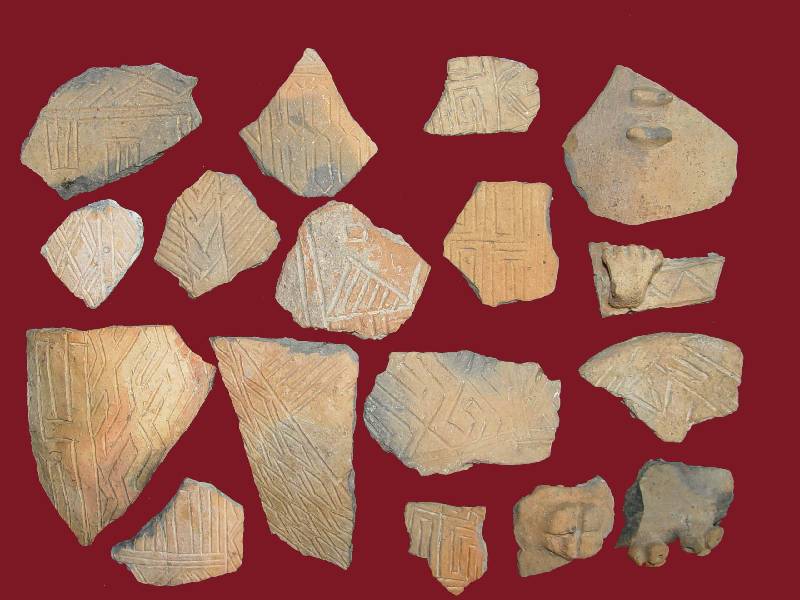 Edénytöredékek meander díszítéssel. Középen látható töredék egy arcos-edény része lehetett. (Kéthalom; Királydomb, korai és klasszikus Tisza-kultúra, »Kalicz«, szt)