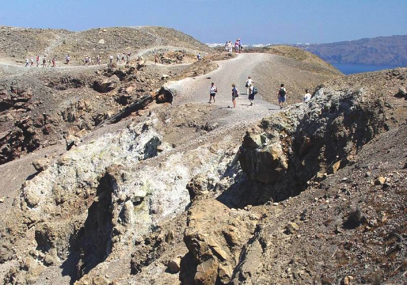 A vulkán napjainkban is él; a kürtőkön keresztül gázok és gőzök távoznak (Szantorini, sz)