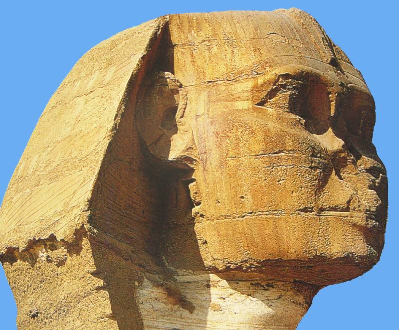 A szfinx nemezfejkendőt visel isteni és királyi hatalma jelképeként (Egyiptom, sz)